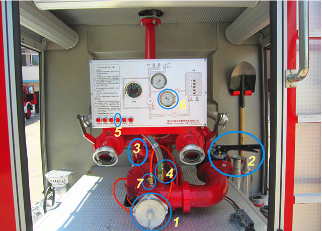 打開(kāi)車(chē)輛總電源→打開(kāi)儀表板電源按鈕→打開(kāi)車(chē)輛取力器→打開(kāi)吸水口接吸水管→打開(kāi)真空泵開(kāi)關(guān)(吸水口上面)→打開(kāi)引水控制按鈕→打開(kāi)后注水按鈕→車(chē)輛給油(真空表達(dá)到0.04MPa)→關(guān)閉引水控制→關(guān)閉真空泵開(kāi)關(guān)→觀(guān)看液位表→吸水完成